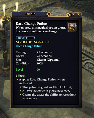 Es mögen sich zwar manchem Rollenspieler bei dem Gedanken die Fussnägel aufrollen, aber die Rasse ist grundsätzlich nicht spielrelevant in EQ2. Solange nicht der für jeden Raid unabdingbare "Trank der absoluten Ubarness" verkauft wird - für mich im grünen Bereich.
